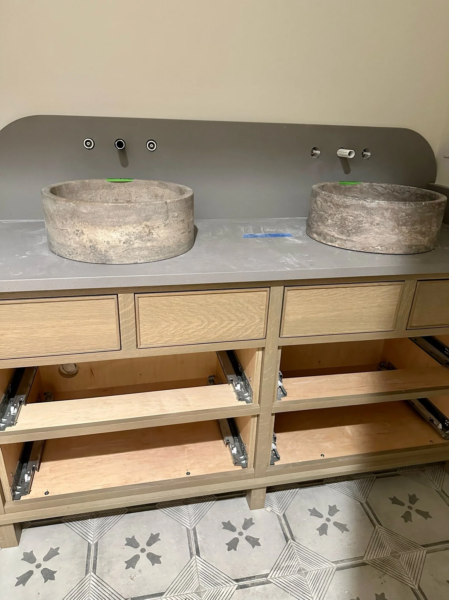 More Lavezzi Quartzite—This was a different slab than I used in our kitchen or primary bathroom and you can see it has some gorgeous natural variety!