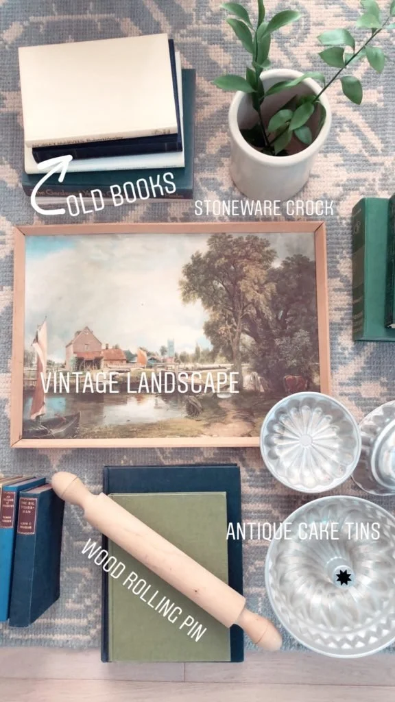 One thing you may not know about me is that even though I love decor and changing things up, I am at my core VERY PRACTICAL. Which means a few things... 1. I don't like to spend a whole lot of time/money to change things 2. I want it to be something that can last (i.e. I don't want to decorate for Halloween and Thanksgiving separately because I just don't have time and it only lasts like a month for each)... so basically what I like to do is add elements of Fall that can carry me through Sept-November when I then start decorating for Christmas. So I want to share a few ways that I cost effectively added some fall flair to my home.First up... for me Fall is about layers. I love to add cozy blankets, a little plaid, some soft greenery-- in this case I used faux Lamb's Ear and fresh Eucalyptus. I actually just came across a great Faux Eucalyptus Garland too that I think I may get for mantel when the real one dies off. I also love a few white pumpkins and also the greenish blue Cinderella ones, which I haven't seen yet this season. Another thing I really love to add is that "Farmer's Market Feel". I love locally grown, unique produce like these beautiful red pears I picked up. I think that sometimes the fresh produce can give a more authentic feel to Fall and plus, it's delicious too!Another thing I love to add to my home is one of a kind pieces. These are typically decor items with a little age that can be found at yard sales, thrift stores or antique malls. I included a little diagram above of some items I found that I felt depict that one of a kind, authentic materials look I love. It's a more raw elemental vibe that I feel like works particularly well for Fall. Small vintage style paintings can also be found new, like these. They're a great addition to shelf decor or pair a couple together to hang on the wall . I love the warmth these small paintings bring and the one I used in my kitchen has some of the fall tones I wanted to incorporate. For the kitchen bringing in items like the wood rolling pin, stoneware crock & antique cake tins can be a fun way to add some layers + interest to shelves and/or walls. I like that they have that feeling of days gone by and are to me a reminder of baking in the kitchen with my grandma when I was a child. I love clean, modern aesthetic, but I think every room should have a little history or age mixed in-- for me that's how you get a fully developed space. Handmade, raw & one-of-a-kind elements add this feeling. The old books are another decor favorite. I picked ones in shades of blue, greens & neutrals. I really like to put books together by color and incorporate them into bookshelves. I was able to find a few different vintage book collections that can be purchased online and that come in a color grouping like I used in my home. You can find additional product links below & also in my instagram stories today or saved under "Seasonal" highlights. I hope these ideas will give you some less traditional and more cost effective ideas to bring Fall elements into your own home! XOXO.Photos taken by Kristina Bills Photography