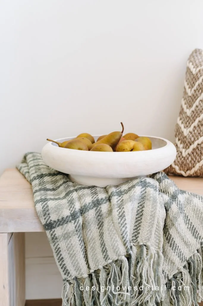 AUTUMN INSPIRED PRODUCE! Think Farmer's Market finds-- rustic pears, squash, peaches or apples. White pumpkins are a favorite I usually bring in come October, but in the meantime these other fresh market finds are a practical and rich way to evoke the feeling of the season without being overtly Fall. I love the way these Bosc Pears I discovered bring in a rich tone & feel to the space. Their ochre coloring is reminiscent of Autumn and I love the more matte look + texture of their skin vs the typical more shiny green/yellow pears. Bonus that they're delicious cut up & served on a cheese tray for Fall entertaining!
