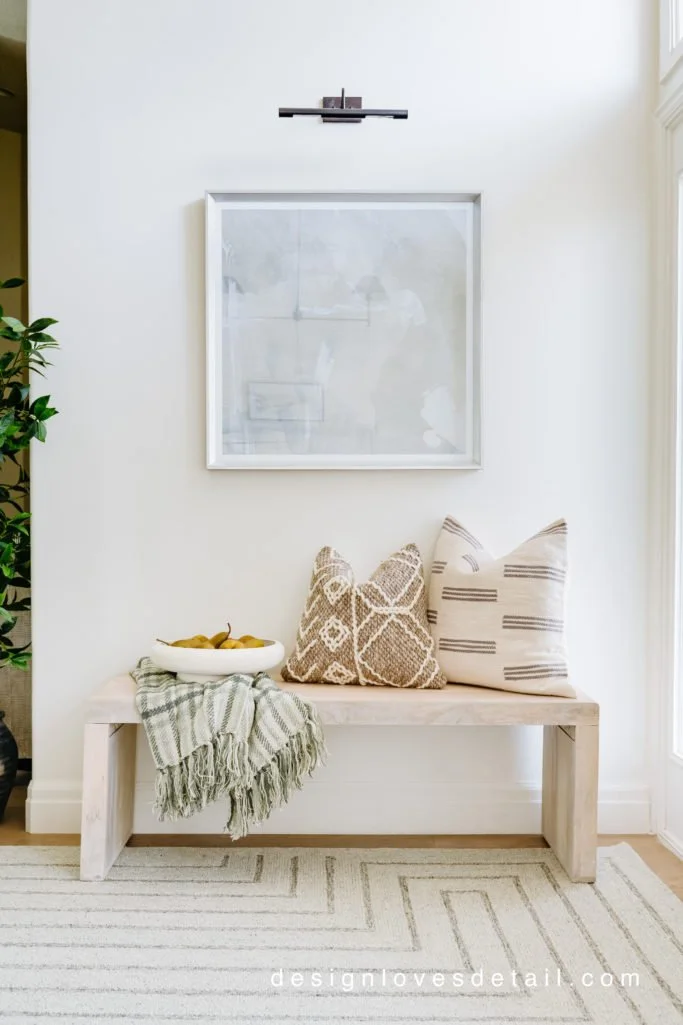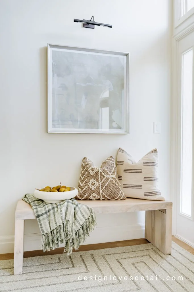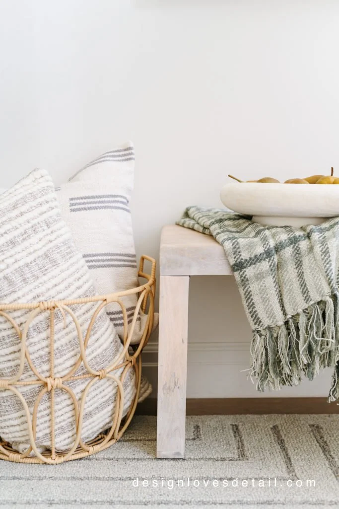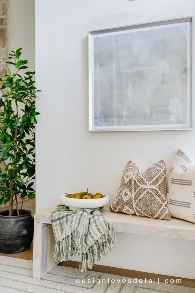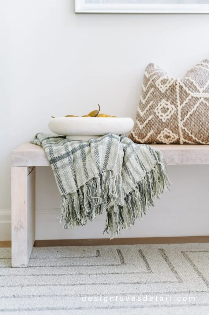 LAYER IT UP! I love adding more layers for Autumn. This definitely brings that cozy, welcoming atmosphere we all seek in the cooler months! From pillows to throw blankets, Fall-inspired textiles provide serenity & depth. They're a great contrast for the simple lines of the Joss & Main wood bench I used for my entry space update. Layers give that lived-in, comfortable feel that inspires the Autumn mood.