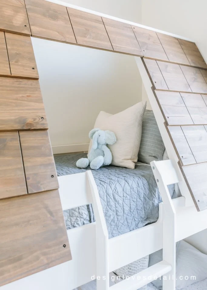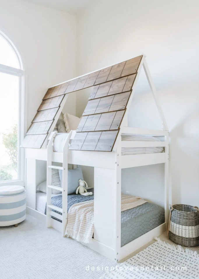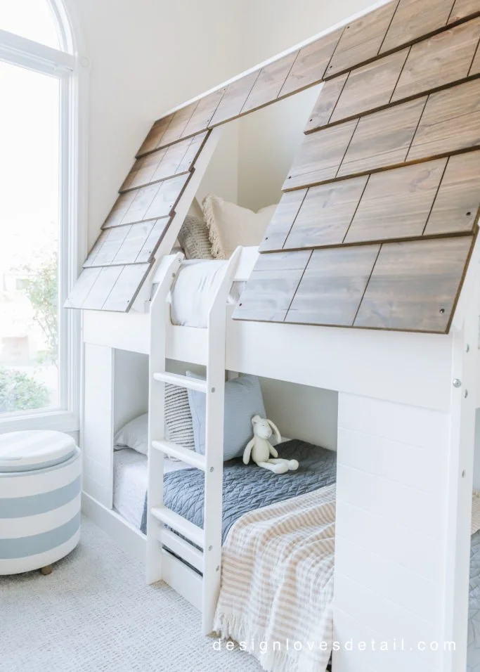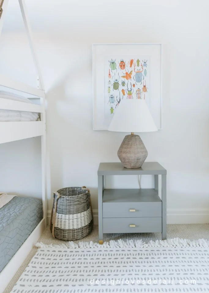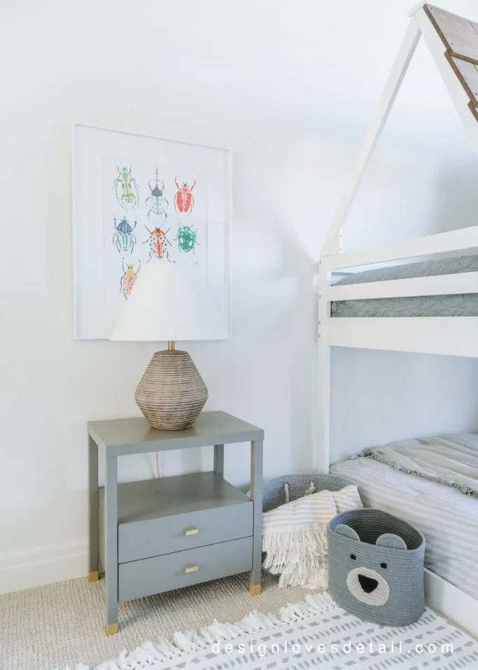 So excited about this fun space!! I wanted to create a whimsical room with lots of function too. These awesome A-frame cabin bunks inspired a subtle modern camping theme that I'm in love with! The colorful bug artwork added the perfect detail (and they're affordable too!). We are loving how much more useful space has been added with changing this from a formal sitting room to a bunk room! I also like that these beds have a similar feel to the ever-popular built-in bunk beds for a bunk room, but they can be ordered online and don't mean a long-term commitment like the built-in ones do! Check out our YouTube video below to see how it used to look and for a closer look at how it turned out!