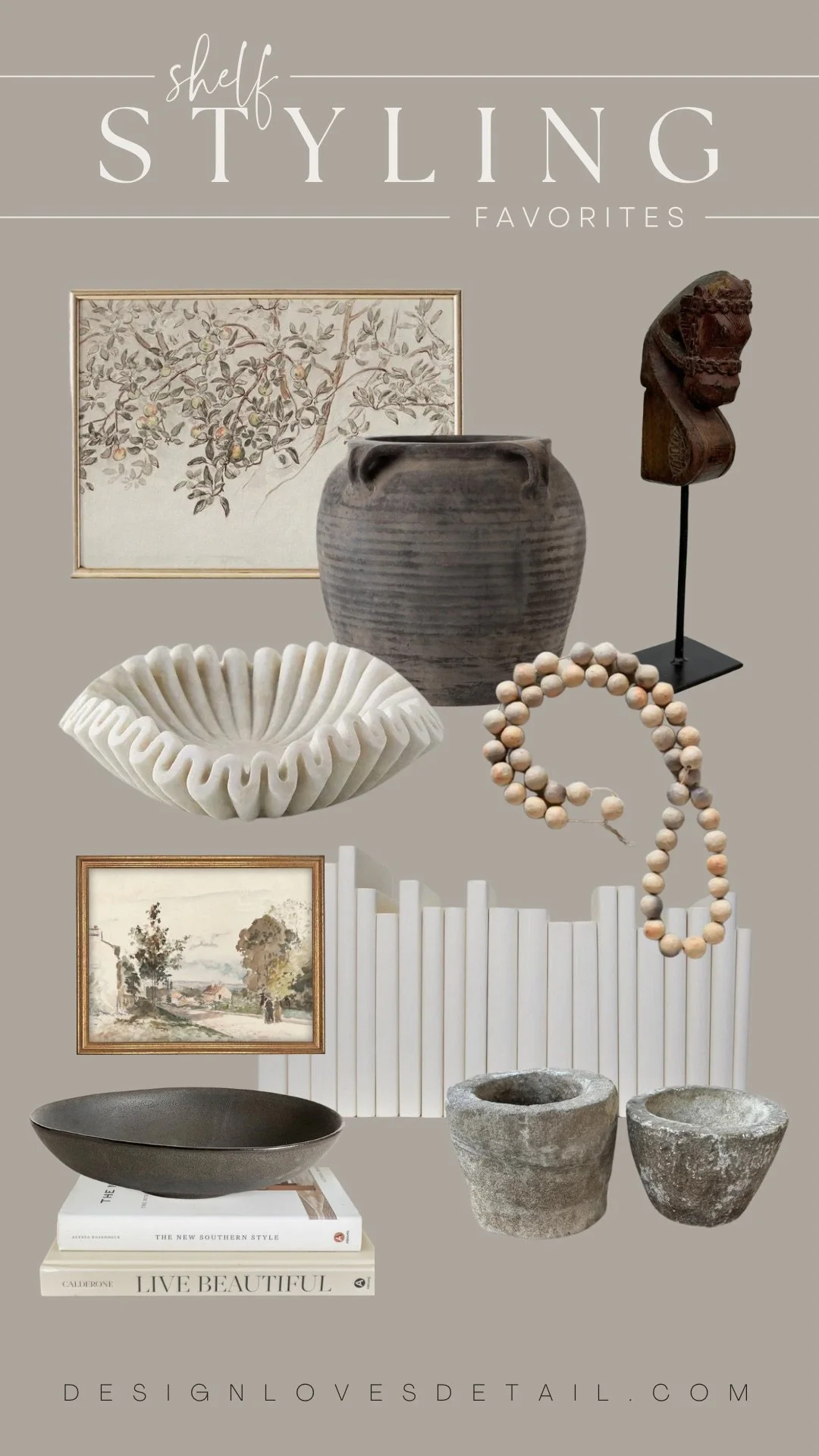 Mixing in smaller framed art pieces is a fun way to add charm. It’s also a good way to establish the feel/color tones for a space. You can buy these pre-framed art pieces below or purchase the Etsy downloads to print + frame your own! I also incorporated a lot of stone pieces. I love travertine, raw wood and vintage pottery for adding that curated feel. With the more neutral colors I love to design with— texture & shape become really important for keeping things interesting! The clay beads & fluted bowl are great examples of shapes/textures that add interest to the shelves. With a minimal style you want to make every piece count! I love this collected feel— adding finds from our travels and past homes to make it unique!