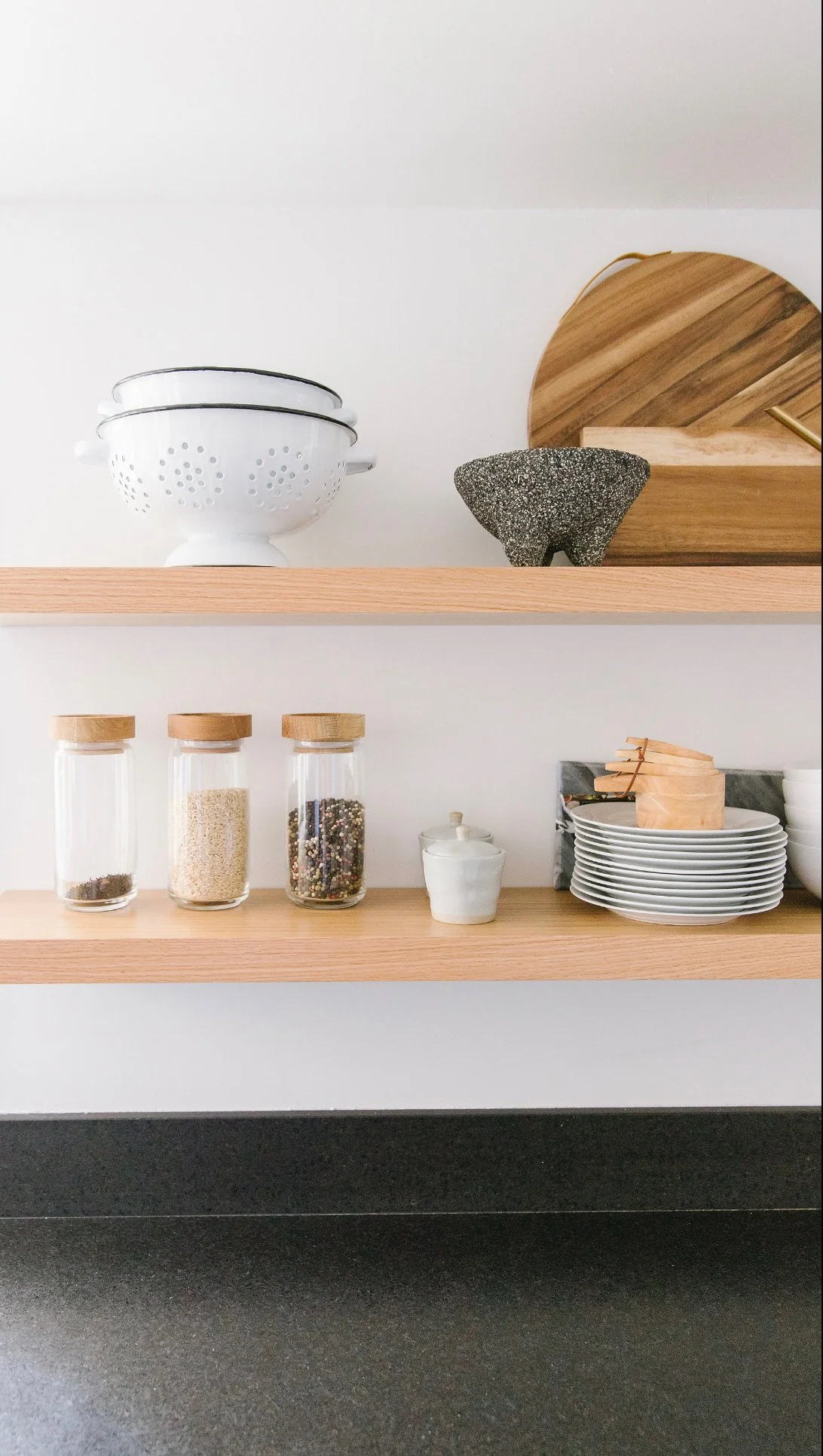 Now, for a touch of glam without the price tag, try open shelving. It's like a mini art gallery for your dishes! Grab some sleek, inexpensive shelves, stack your prettiest plates, mugs, and jars, and voilà - instant chic vibes! Glass jars and containers are perfect for making open shelving look clean and put together while still letting you see what’s inside!!